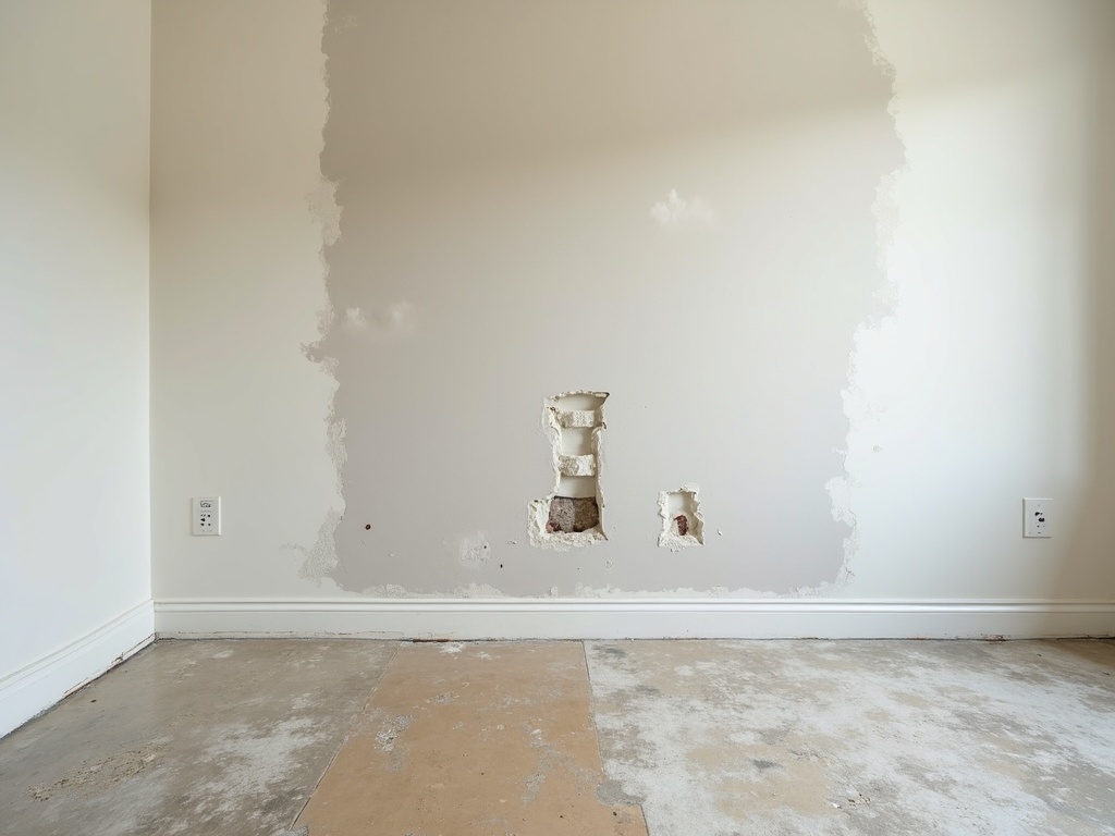 Full wall restoration after pipe burst damage, including mold treatment and new drywall installation.
